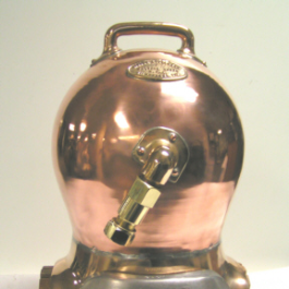 The Shallow Water Helmet differs from other diving helmets in that the breastplate and top are permanently joined together. The helmet rests on the divers shoulders without being attached to a diving dress.