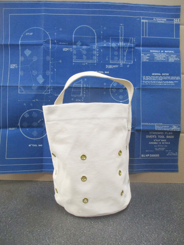 The 12" tall Diver's Tool Bag is made of White canvas. It is fitted with Brass grommets for drainage. The arched handle makes carrying easy. The bag is made to US Navy Bureau of Ships drawing 516693 dated June 1, 1942. Materials may vary from the drawing depending on availablility.